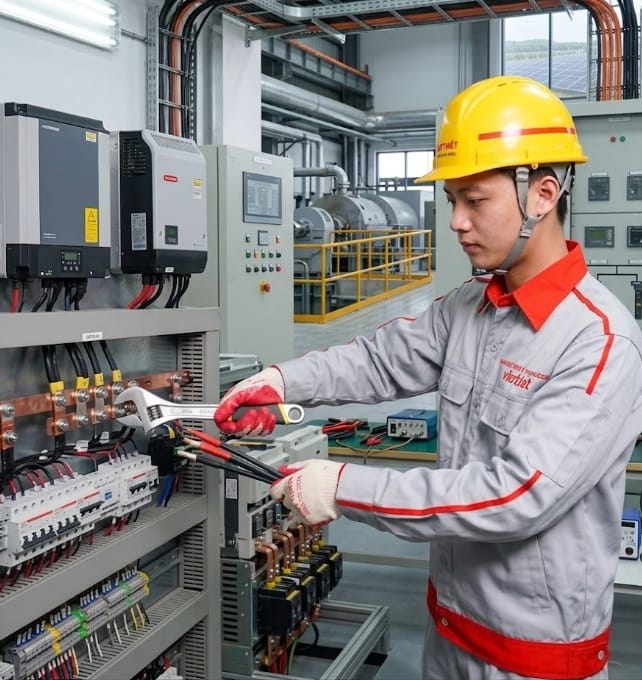 Đối với thiết bị biến tần (Inverter), thời gian bảo hành chính hãng sẽ dao động từ 5 đến 10 năm tùy thuộc vào từng nhà sản xuất. Tương tự, hệ thống pin lưu trữ Lithium cũng được bảo hành đổi mới trong vòng 5 năm đầu tiên sử dụng. Nhìn chung, mọi thiết bị phát sinh lỗi kỹ thuật từ nhà sản xuất đều được chúng tôi đổi mới nhanh chóng. Khách hàng hoàn toàn không phải chịu thêm bất kỳ chi phí vận chuyển hay nhân công tháo lắp nào.